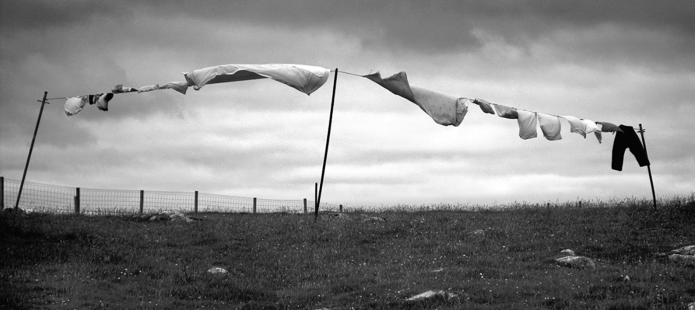Clothesline on the windswept prairie. The notched pole in the middle was removed when hanging the clothes or taking them down.